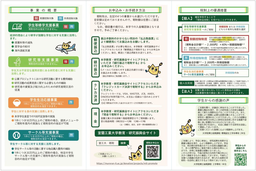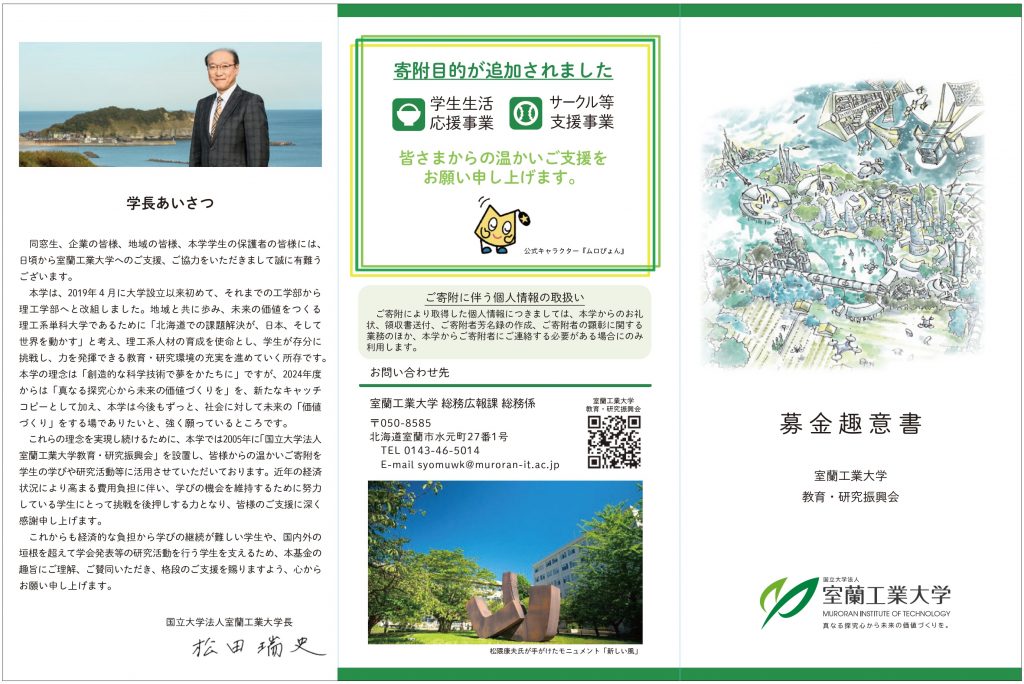 国立大学法人室蘭工業大学教育・研究振興会は、室蘭工業大学の理念・目標の達成を目的とし、室蘭工業大学の教育・研究の発展に資するとともに、地域及び我が国の経済・社会文化の発展に寄与することを目的として、平成17年に設置しました。現在、学生等修学支援事業、研究等支援事業の2つの基金を設置し、運営しています。