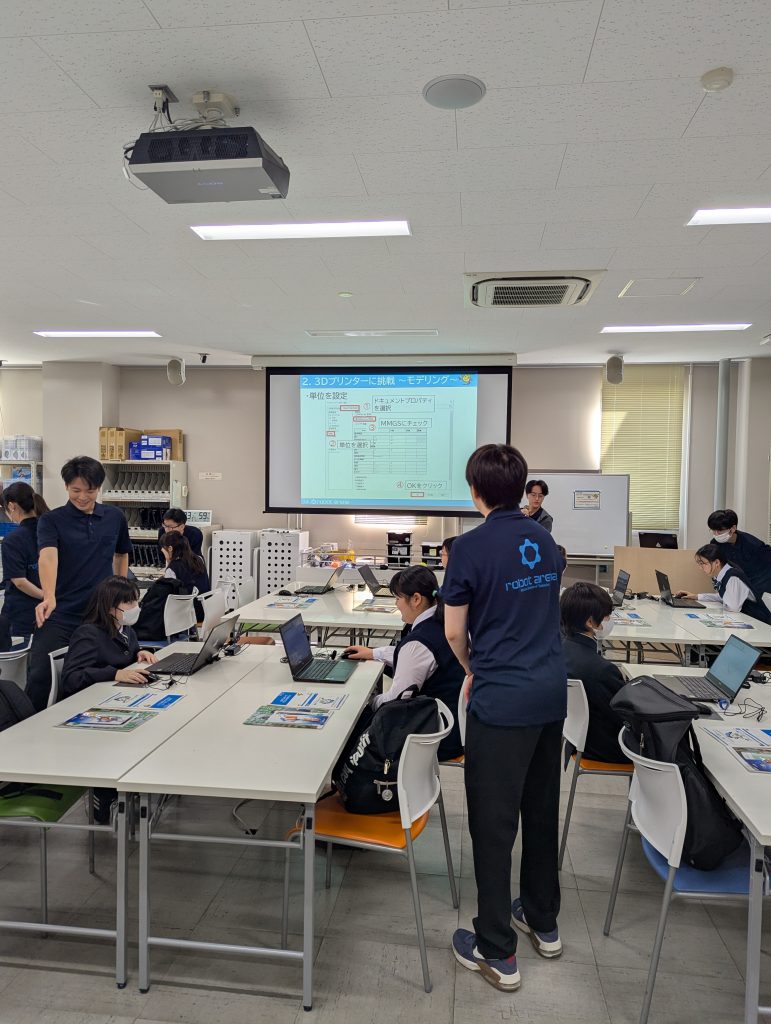 一行は、本学ロボットアリーナにおいて、ロボットアリーナスタッフの指導のもと、パソコンソフトを駆使しながら3Dプリンタで自分の名前入りのムロぴょんキーホルダーを作成しました。