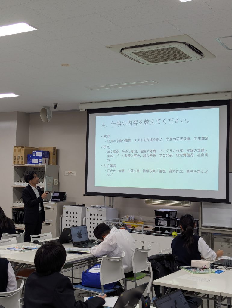 その後、花島直彦教授から、本学の概要紹介と本学が取り組んでいるJST女子中高生の理系進路選択支援プログラムについての説明を受け、生徒の皆さんからは「大学の先生の仕事の内容を教えてください。」といった質問もあり、初めての体験でしたが、終始笑顔で、楽しみながら取り組んでいました。