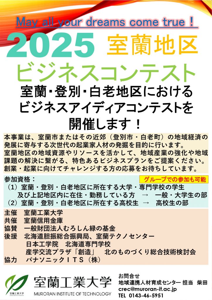 室蘭工業大学が主催となり、地域の未来を担う次世代の起業家を発掘・育成することを目的に、室蘭・登別・白老地区を対象としたビジネスアイディアコンテストを開催いたします。
