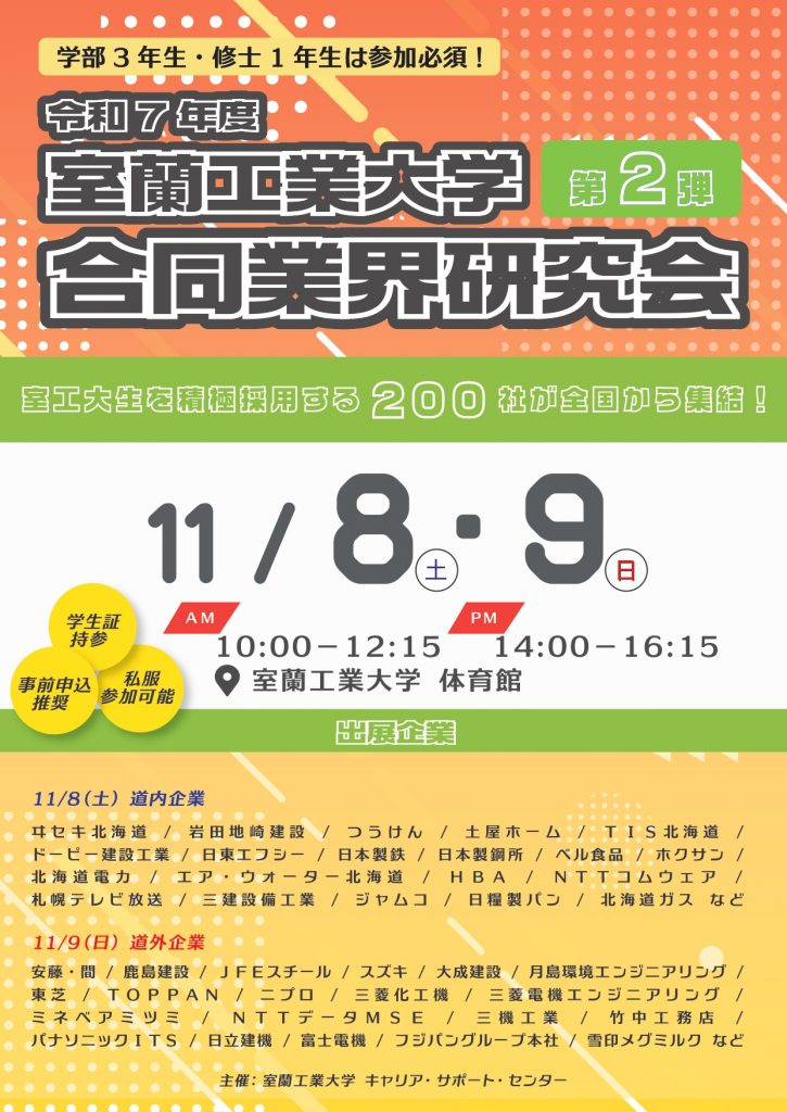 令和7年11月8日(土)・9日(日)に、令和7年度合同業界研究会の第2弾を開催します。全国から約200社(各日約100社)の企業・団体が来学し、事業内容や業界動向、インターンシップの受入状況などについて、企業担当者から直接話を聞くことができます。