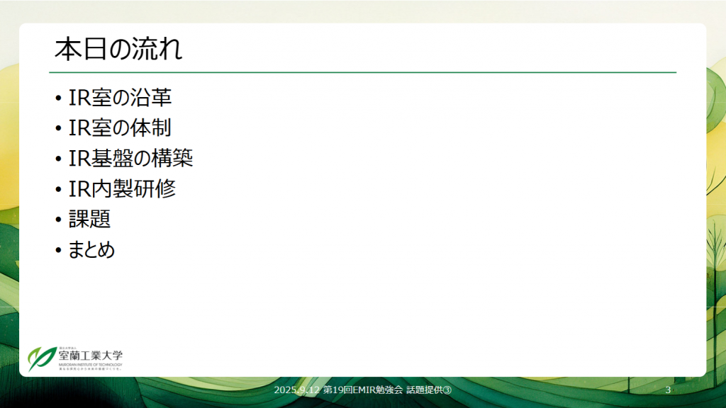 令和7年9月12日(金)、大正大学にて開催された「第19回 EMIR勉強会」に、室蘭工業大学から経営企画課経営企画係の田嶋係長と、評価分析係の白川部係長の2名が参加し、話題提供しました。