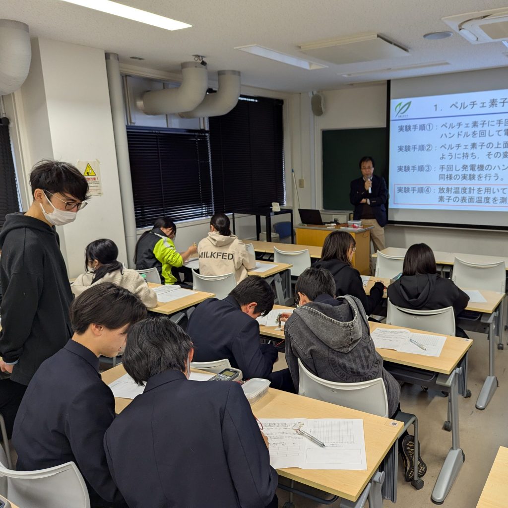 一行は、教育・研究1号館C棟講義室において、希土類材料研究センターによる「圧力をかけて室温で氷を作る実験」と「ペルチェ素子の通電実験」を体験しました。生徒の皆様からは時折、驚きの声があがり、終始、熱心に実験に取り組んでいました。