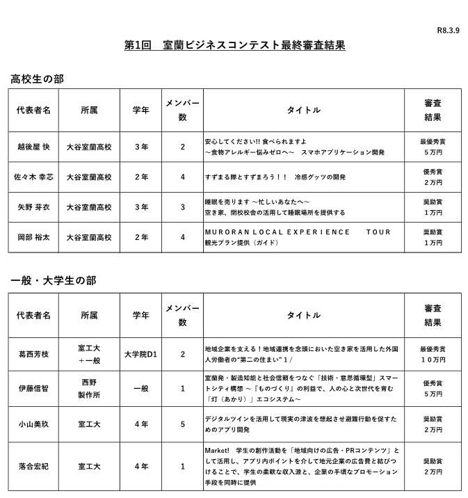 令和8年3⽉9⽇(⽉)、教育・研究1号館N104講義室において、室蘭ビジネスコンテスト最終審査会を開催しました。