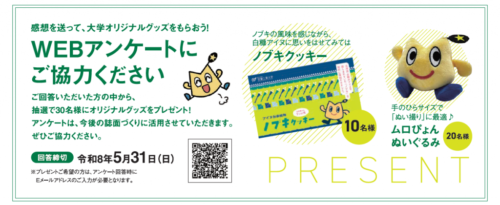 今後の誌面づくりに活用させていただくため、蘭岳(RANGAKU)の読者アンケートを実施しています。アンケートにご協力いただいた方には抽選で合計30名様に「室蘭工業大学オリジナルグッズ」をプレゼントいたします。是非、ご協力ください。