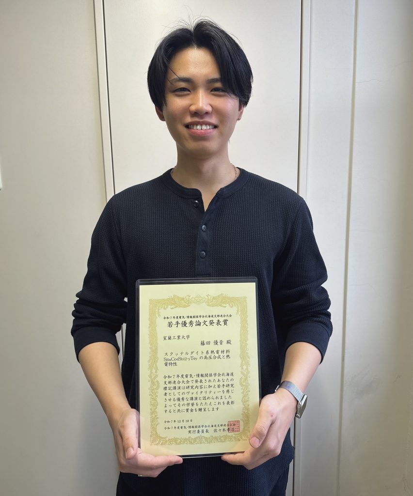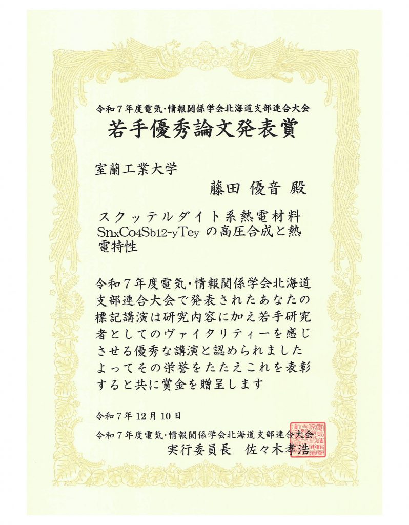 令和7年11月2日(日)と3日(月)に、室蘭工業大学にて開催の令和7年度 電気・情報関係学会北海道支部連合大会における発表で、本学大学院情報電子工学系専攻電気電子工学コースの藤田優音さんが「若手優秀論文発表賞」を受賞しました。