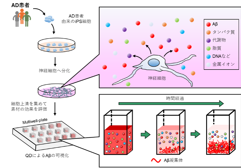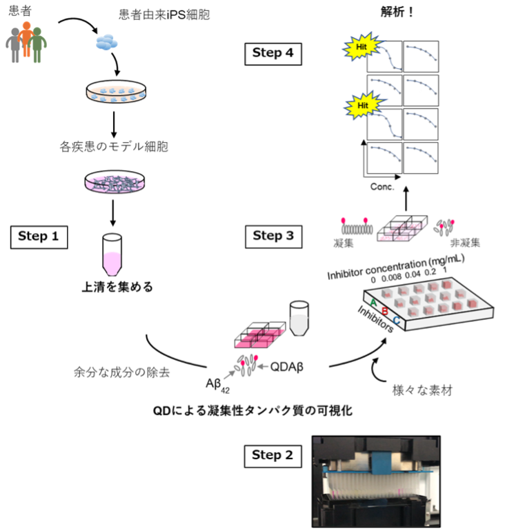 本研究では、室蘭工業大学が開発した量子ドット(QD)によるAβ凝集過程の可視化法を応用したタンパク質凝集抑制物質の微量ハイスループットスクリーニングシステム(特許第7166612号、PCT/JP2019/51077)と、株式会社カネカ 再生・細胞医療研究所のiPS細胞培養技術を組み合わせ、患者iPS細胞から分化誘導した神経細胞の培養上清中で凝集阻害物質をスクリーニングする新たなスクリーニング手法 High‑throughput screening technology for Aggregation Inhibitors of Diseased cell‑derived Aggregative Proteins (HaiDap)を開発しました。