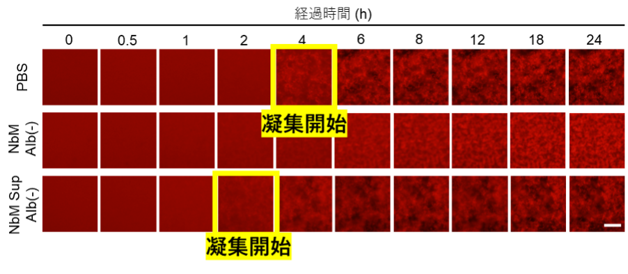 Aβは、一般的な実験で用いられる生理的塩濃度の溶液(PBS)よりも培養上清中で早期に凝集開始し(PBS約4時間、培養上清約2時間)、細胞分泌由来の低分子やAβオリゴマーが凝集促進に寄与することを示しました。