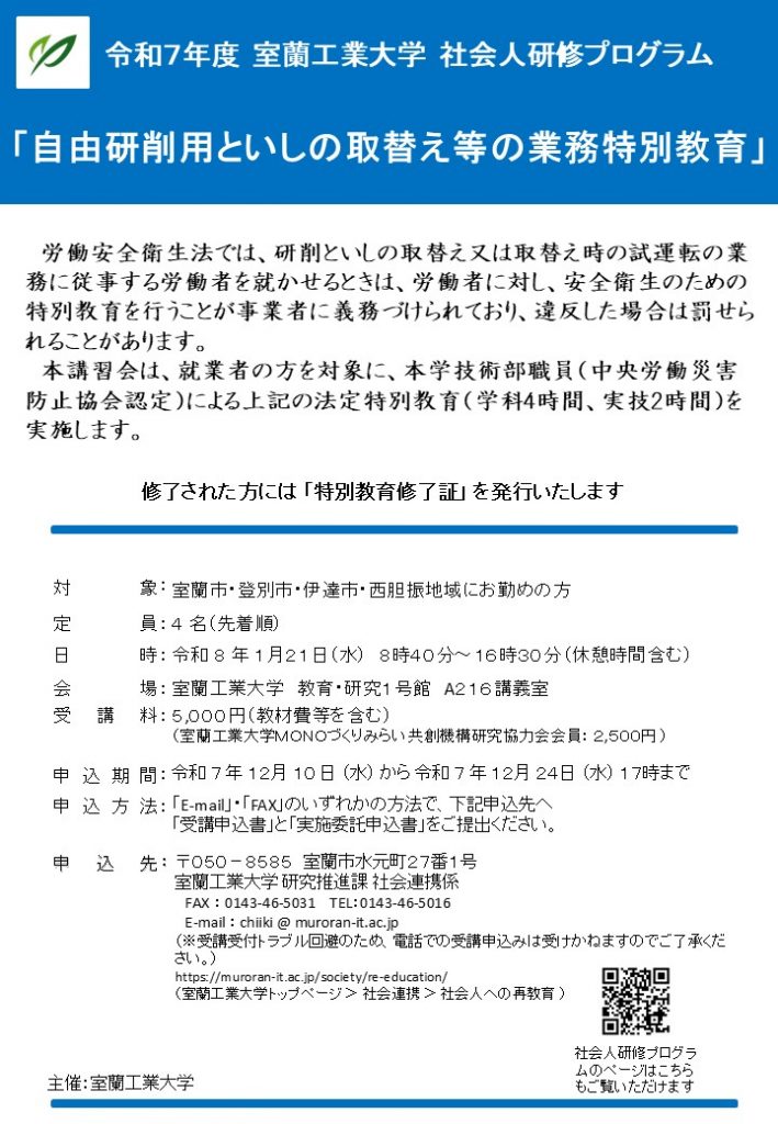 自由研削用といしの取替え等の業務特別教育 令和8年1月21日(水)8:40~16:30(休憩時間を含む)