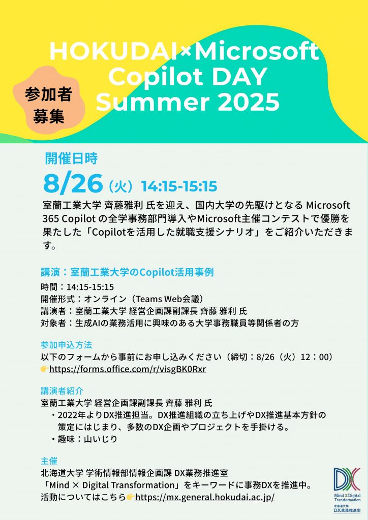 令和7年8月26日(火)、北海道大学にて開催された「HOKUDAI × Microsoft Copilot DAY Summer 2025」において、本学デジタル・キャンパス推進室の齊藤室員が登壇し、本学におけるMicrosoft Copilotの活用事例について発表を行いました。
