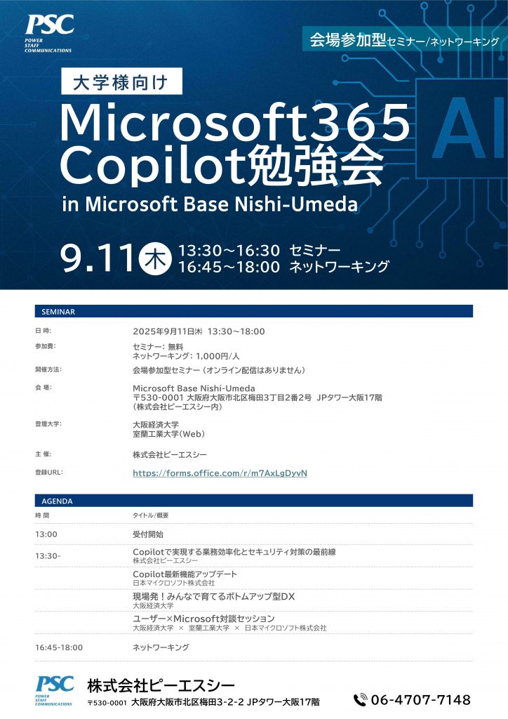 令和7年9月11日(火)、Microsoft Base Nishi-Umedaにて開催された「Microsoft 365 Copilot勉強会(主催:株式会社ピーエスシー)」において、本学デジタル・キャンパス推進室の齊藤室員が登壇しました。