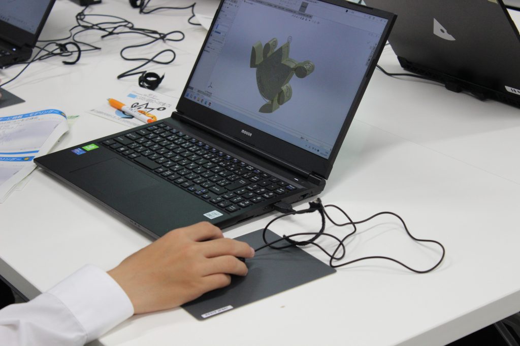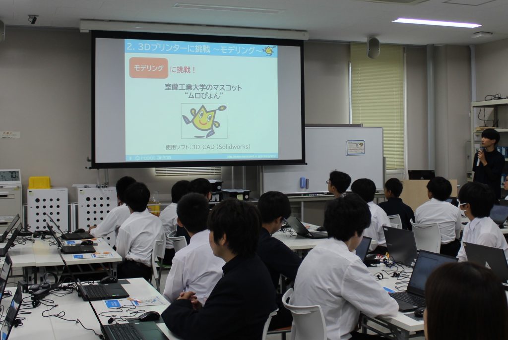 一行は、本学ロボットアリーナにおいて、ロボットアリーナスタッフの指導のもと、パソコンソフトを駆使しながら3Dプリンタで自分の名前入りのムロぴょんキーホルダーを作成しました。