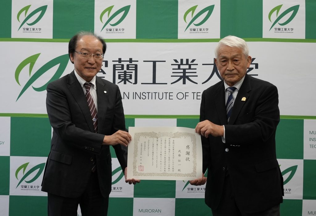 令和7年9月25日(木)に、本部棟3階小会議室において、本学に多額のご寄附を賜りました本学同窓生 武藤征一様に対して、感謝状贈呈式を挙行しました。