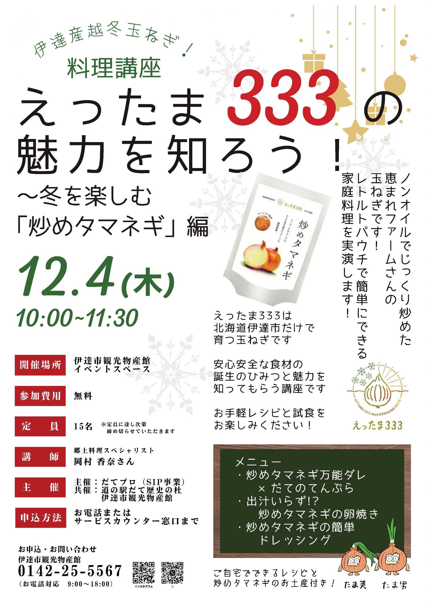 令和7年12月4日(木)に伊達市観光物産館にて北海道伊達市産ブランド玉ねぎ「えったま333」の加工品「炒めタマネギ」の魅力を体験する料理講座 「えったま333」の魅力を知ろう!冬を楽しむ「炒めタマネギ」編が開催されます。