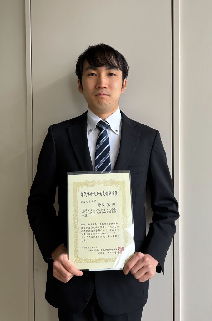 この度、令和7年度 電気・情報関係学会北海道支部連合大会にて電気学会北海道支部発表賞を受賞することができ、大変光栄に思います。本研究を通じて、物質の磁性について新たな知見をたくさん得ることができました。本成果は、日頃から熱心にご指導くださる関根先生や研究室メンバーの支えがあってこそ得られたものです。本受賞を励みに、今後も社会に貢献できる研究を目指して取り組んでいきたいと考えております。