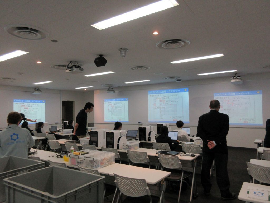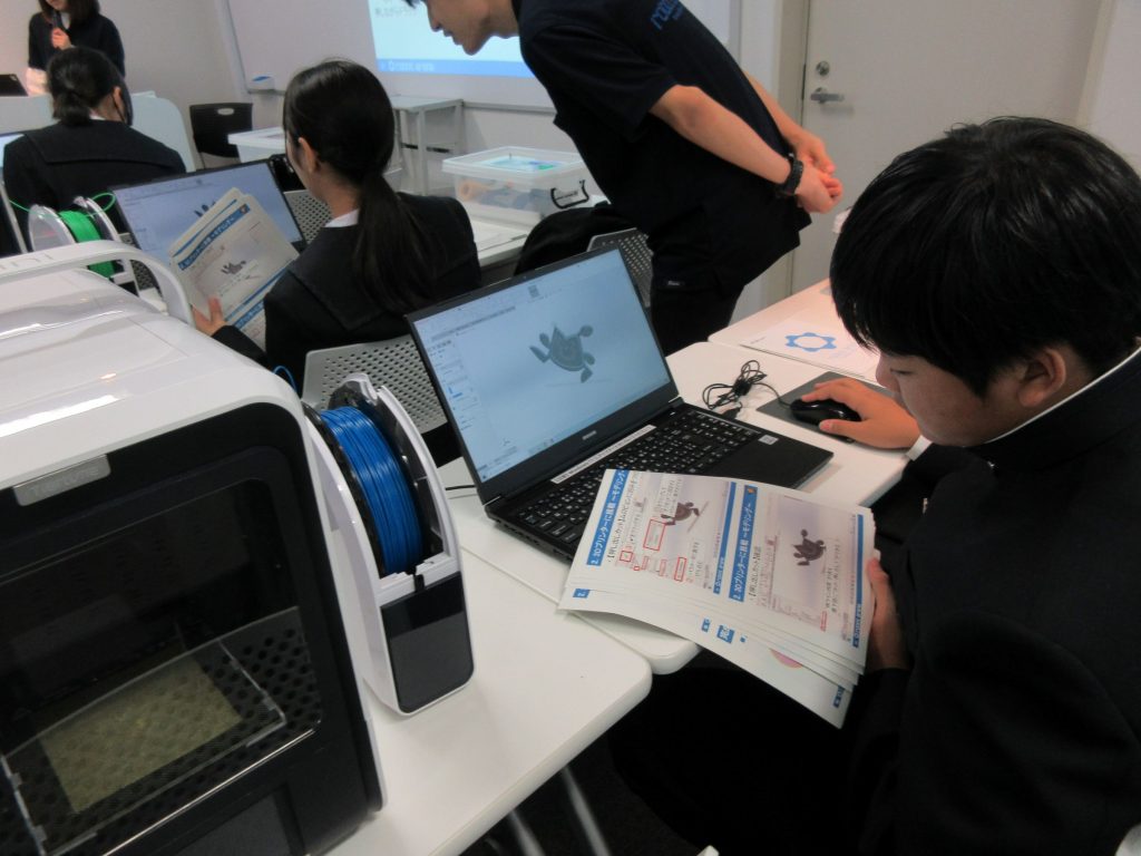 一行は、ロボットアリーナ職員指導の下、3Dプリンタでキーホルダーを作製する体験学習を受講しました。