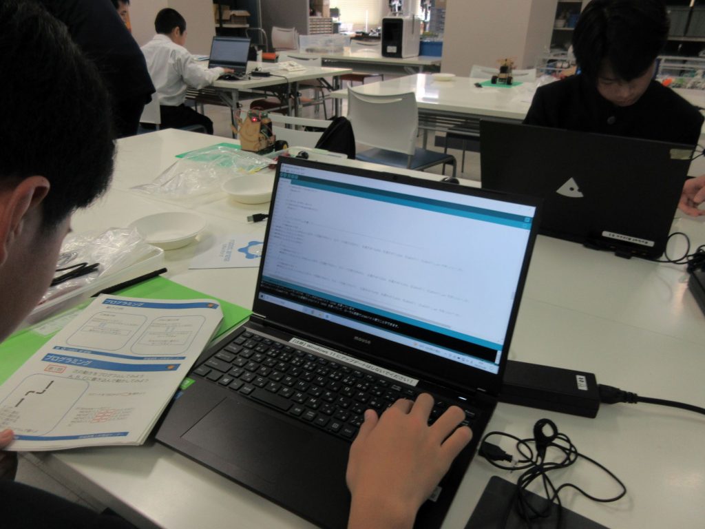 一行は、ロボットアリーナ職員指導の下、プログラミングで動くリモコンカーの作成をしました。